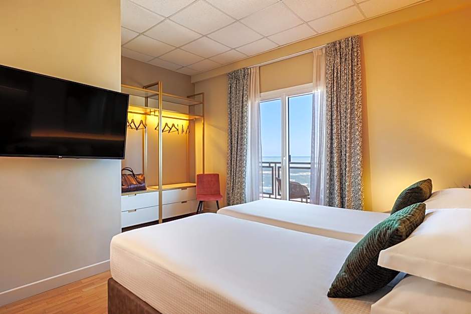 The Spirit for Two - Front Sea View is 312 square feet and includes either 2 single beds 80-130 width or a double bed 131-150 width plus balcony, terrace, satellite tv , hairdryer, and safe and is Wheelchair-accessible.